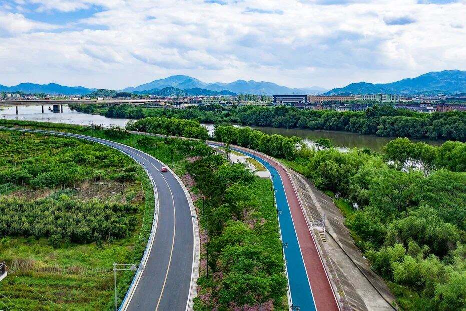 2013年,萧山全面启动浦阳江综合整治工程。历经数年系统治理,浦阳江防洪标准提升至50年一遇,并成功创建为省级美丽河湖。江堤上,17.8公里红蓝相间的跑道自浦阳,经临浦一直延伸至进化,如彩色丝带般蜿蜒江畔。